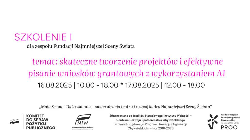W tym miejscu, na naszej stronie, chcemy podzielić się Wam procesem zmian, które będziemy zachodzić przez najbliższe kilka miesięcy, w czasie realizacji projektu „Mała scena – duża zmiana – modernizacja teatru i rozwój kadry Najmniejszej Sceny Świata”. Ta podstrona powstała w ramach projektu i jest finansowana ze środków Narodowego Instytutu Wolności w ramach PROO.